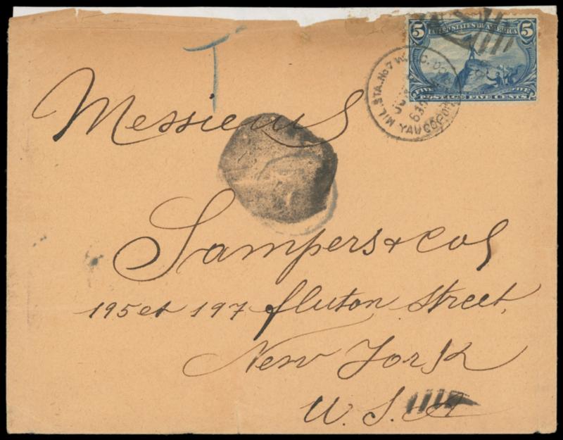 Mil. Sta. No 7, W.D.C., Yauco, Porto Rico, Jun 9, 99. Clear military duplex ties 5¢ Trans-Mississippi (288) on 1899 buff cover to New York city, blue crayon "T" due marking, bold "Mil. Sta. No 4 W.D.C., San Juan, Porto Rico, Rec'd, Jun 10, 99" transit backstamp, partial New York arrival; top edge faults, Fine and rare Porto Rico military station. Estimate; $300 - 400. US$300-400 (Image)