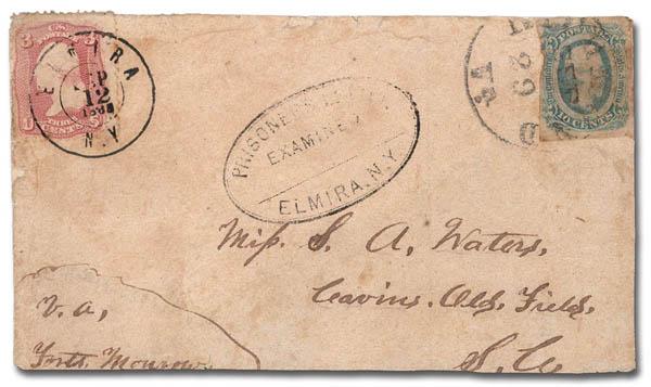Confederacy, 1863, 10¢ Jefferson Davis, blue, used on an 1864 cover with "PRISONER'S LETTER EXAMINED/ELMIRA N.Y." (Scott 11), with US #65 tied by Elmyra, NY c.d.s., with Jack Molesworth's detailed pencil notes on the reverse. Some faults as would be expected, otherwise Fine, ex-Finny, a rare usage. Estimate $300 - 400. (Image)