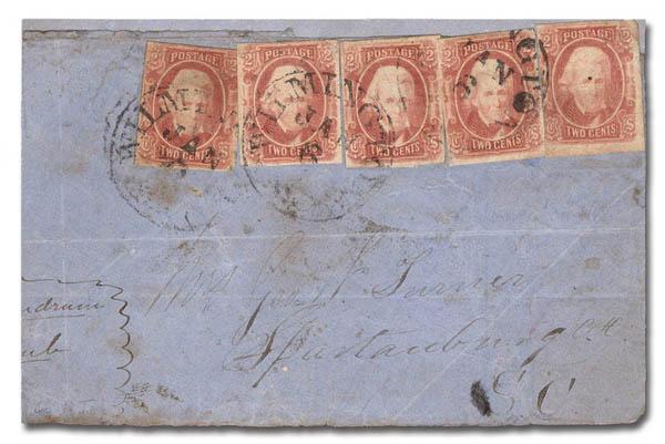 Confederacy, 1863, 2¢ Andrew Jackson, brown red, used on an 1864 turned cover (Scott 8), five singles tied by Wilmington, N.C. c.d.s. on turned cover front to Spartanburg,S.C.; reverse use with 10¢ greenish blue (CSA #12c) with Spartanburg, SC 1864 c.d.s. to 27th S.C.Volx., Petersburg, VA; stamps have been removed and emplaced from whence they originated, cover front has been repaired at top andhas small sealed tears; third stamp has a pre-usage vertical crease, the 10¢ stamp has a small marginal faulth at top left, Brian Green certificate. Estimate $400 - 600. (Image)