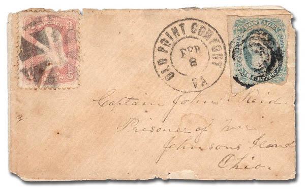 Confederacy, 1863, 10¢ Jefferson Davis, blue, used on cover with "PRISONER'S LETTER EXAMINED/JOHNSON'S ISLAND O." (Scott 11), plus US #65, Old Point Comfort VA. postmark. Cover with faults as typical, otherwise Fine. Estimate $500 - 750. (Image)