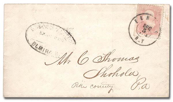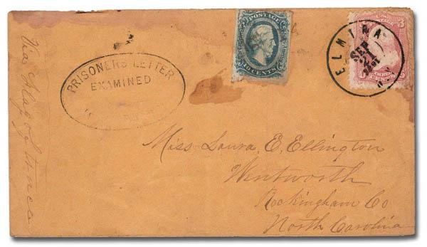 1861, 3¢ Washington, rose, used on an 1863 cover with "PRISONER'S LETTER EXAMINED/ELMIRA N.Y." (Scott 65), with Elmira New York c.d.s., plus oval "Prisoner's Letter Examined" alongside, and with content which thanks the recipient for sending tobacco, Fine to Very Fine. Scott $150. Estimate $75 - 100. (Image)