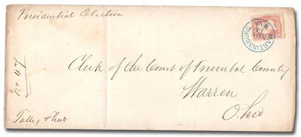 1861, 3¢ Washington, rose (Scott 65), tied by a blue Martinsburg, W. Va Nov 14 c.d.s. on a Presidential Election return of a tally sheet to Warren, Ohio, Fine to Very Fine. Estimate $150 - 200. (Image)