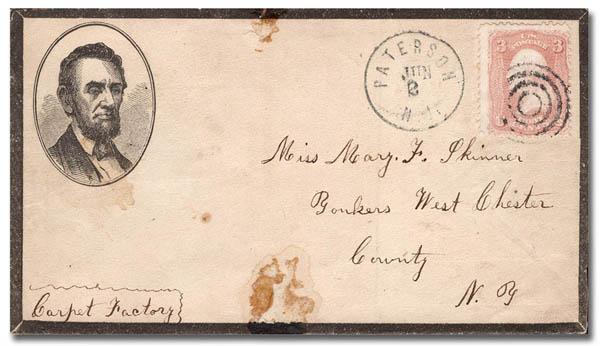 1861, 3¢ Washington, rose (Scott 65), used on a patriotic Lincoln mourning cover from Patterson, NJ. Scott $140. Estimate $75 - 100. (Image)