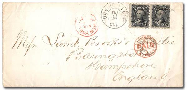 1861, 12¢ Washington, black (Scott 69), horizontal pair on an 1869 cover from California via New York to Basingstock, England, with a Nevada Revenue seal on the reverse, Fine to Very Fine. Estimate $200 - 300. (Image)
