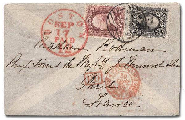 1861, 12¢ Washington, black + 3¢ Washington, rose (Scott 69, 65), used on an 1862 lady's cover to Paris, France, with gorgeous cancels and transit markings, and 4 backstamps, Very Fine, unusually nice. Scott $160. Estimate $150 - 200. (Image)