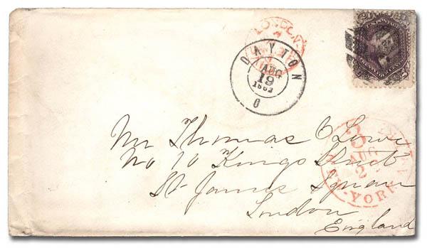1862, 24¢ Washington, red lilac (Scott 70), used on an 1862 cover from Dayton, Ohio via New York to London, England, Fine to Very Fine. Scott $350. Estimate $150 - 200. (Image)