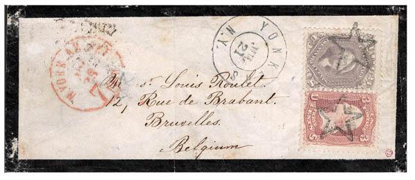 1862, 24¢ Washington, brown lilac + 1861, 3¢ Washington, rose (Scott 70a, 65), paying the 27¢ rate on an 1863 mourning cover to Brussels, Belgium, the stamps canceled or tied by Hollow 5-Point Star fancy cancel (Skinner-Eno ST-O 11), with "Yonkers N.Y. Jul. 21" (1863) double-circle datestamp and red "N. York Am. Pkt. 7 Paid Jul. 25" transit cancel, AM. PACKET backstamp and receiving backstamp. A lovely and very attractive cover, Very Fine, with 1989 P.F. certificate. Estimate $300 - 400. (Image)