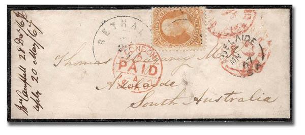 The rate to South Australia at the time was 12¢ per half ounce via British Mail, so this was an 8x rate usage - most unusual - and even more unusual, it was marked MORE TO PAY.(Image)
