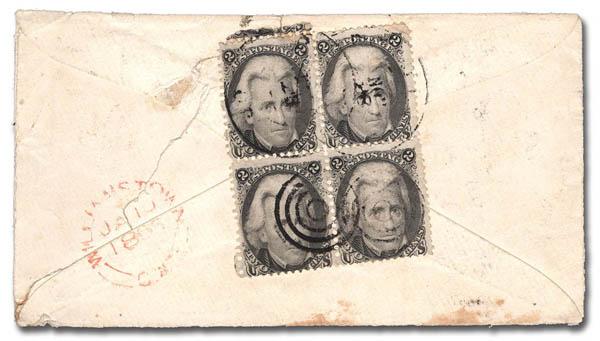 1863, 2¢ Jackson, black (Scott 73), a block of 4 (on the reverse) and a single (on the front), used on an 1865 cover to Williamstown, Canada West. The front shows an oval U.S. 10 Cts PAID handstamp (unusual). Some cover tears and the stamp on the front has been torn, otherwise Fine. Scott prices a block of 4 off cover at $3,250, on cover is unpriced - and very rare! Scott $3,250. Estimate $1,500 - 2,000