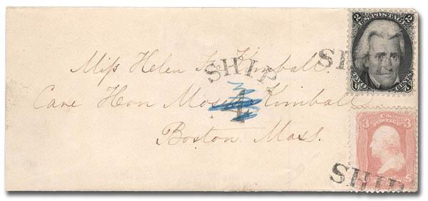 1863, 2¢ Jackson, black + 1861, 3¢ Washington, rose (Scott 73, 65), neatly tied by "SHIP" postmarks on an extraordinary and very attractive cover to Boston, a gem from the Harry F. Allen collection and featured in Lane's book on Allen's Black Jacks, signed on the reverse by Stanley B. Ashbrook, plus a letter from the same denoting the rarity of the cover for its unusual rate, Very Fine, see images on the web. Estimate $500 - 750. (Image)