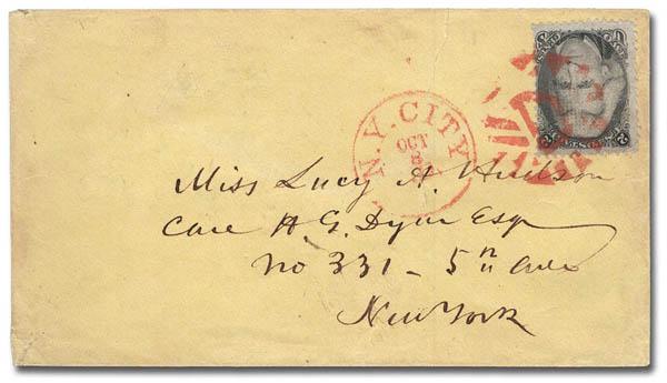 1863, 2¢ Jackson, black (Scott 73), tied by a fancy bright red cancellation on a New York City drop cover, Fine to Very Fine. Scott $155. Estimate $75 - 100. (Image)