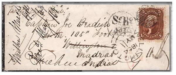 1862, 5¢ Jefferson, red brown (Scott 75), tied on an 1863 mourning cover to Wellington, India (a town in Tamil Nadu), forwarded to Madras, India, with "Wellington MY 4, 1864" double-circle datestamp with day in manuscript, two additional similar markings on back, blue London (Mar. 28, 1863), Bombay (Jan. 26, 1864), 4 annas due marking, docketed at left "Written March 14th 63, Rec'd. May 64", Fine to Very Fine, unusual. Estimate $300 - 400. (Image)