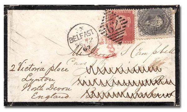 1863, 24¢ Washington, lilac (Scott 78), cork canceled and used on an 1867 mourning cover to Belfast, Ireland, forwarded to Lynton, England, the original address crossed out by wavy lines, forwarding postage paid by Great Britain 1864 1d red (33) tied by "Belfast SE 12 67" with "62" in diamond grid duplex datestamp, red "3" credit circular postmark, Belfast and Barnstable backstamps. Some slight edge wear, Fine to Very Fine, ex-Gibson, a lovely mixed franking. Scott $425. Estimate $300 - 400. (Image)
