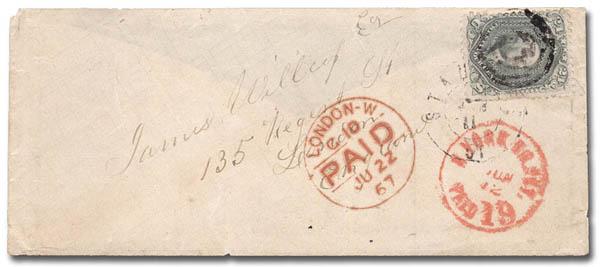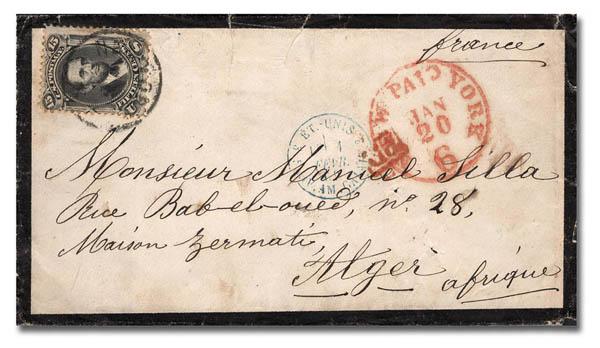 1867, 15¢ Lincoln, black, F. grill (Scott 98), with several noticeable grill points, tied by New York circular datestamp on an 1869 mourning cover to Alger, Algeria, red "New York Paid 6 Jan. 20" credit datestamp, blue Calais entry datestamp (Feb. 1), Paris, Avignon and Alger backstamps. Some edge wear and minor toning around perfs, otherwise Very Fine, a scarce use to Algeria, rates to this destination were the same as for France which is possibly why the sender wrote "france" at upper left. Scott $325. Estimate $300 - 400. (Image)