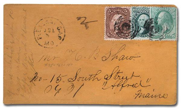1867, 5¢ Jefferson, brown, F. grill + 1861, 10¢ Washington, green + 1870, 3¢ Washington, green, without grill, N.B.N.C. printing (Scott 95, 68, 147), an uncommon mixed-issue franking, used on a cover from Pleasant Gap, MO to Alfred, Maine (apparently a registry usage), Fine. Scott $950+. Estimate $300 - 400. (Image)