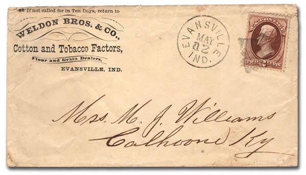 1870, 2¢ Jackson, red brown, without grill, N.B.N.C. printing (Scott 146), single tied by Evansville, IN "Shoo-Fly" fancy cancel (Cole BT-11 or BT-12) on an attractive cover to Calhoone, KY, with a tobacco merchant's corner card, Fine to Very Fine, with 2002 P.F. certificate. Estimate $500 - 750
