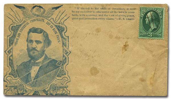 1872, Grant Campaign (Milgram UG-27), design in blue on a cover to Graton, Mass., franked with pen-canceled 3¢ Bank Note; minor soiling and a repaired tear at right, the address is very faint, Fine overall. Estimate $75 - 100