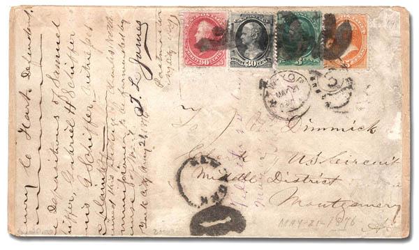 1873, 90¢ Perry, rose carmine+ 30¢ Hamilton, gray black + 3¢ Washington, green, + 15¢ Webster, yellow orange, C.B.N.C. printings (Scott 166, 165, 158, 163), tied on a May 21, 1876 courthouse cover from New York to Montgomery, Alabama. Some soiling, reduced at sides and refolded at top and bottom, the stamps with a few faults, Fine appearance. Scott prices the 90¢ alone on cover at $7500. Estimate $1,000 - 1,500