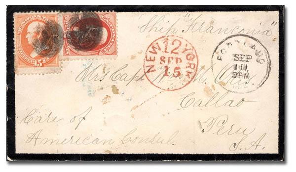 1873, 15¢ Webster, yellow orange, C.B.N.C. printing + 1875, 2¢ Jackson, vermilion, C.B.N.C. printing (Scott 163, 178), used on an 1877 mourning cover from Portland Maine via New York to Callao, Peru, the stamps tied by corks, the cover marked via Ship "Franconia". Reverse bears a horizontal pair of Peru 5c vermilion Postage Due (odd, since the franking fully paid the 17¢ rate), matching "Callao 3 OCT 77" double-circle postmark. An attractive and very scarce usage with postage due stamps, Very Fine. Estimate $300 - 400. (Image)