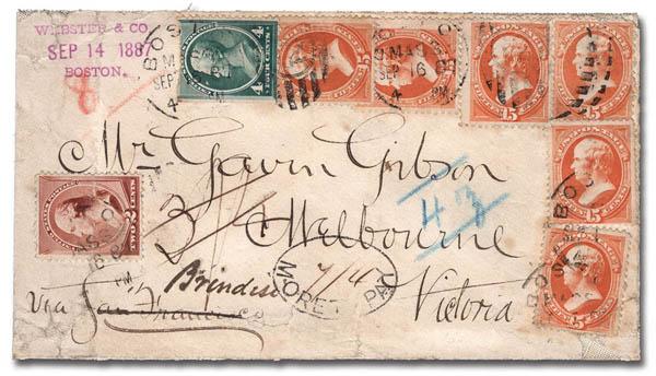 1879-83, 2¢ Washington, red brown + 4¢ Jackson, blue green + six 15¢ Webster, red orange (Scott 189, 210, 211), used on an 1887 cover from Boston to Melbourne, Australia, with original routing "via San Francisco" crossed out and "via Brindisi" (Italy) added, and with London and Melbourne backstamps. An attractive 3-color franking to an uncommon destination, Fine to Very Fine. Estimate $400 - 600
