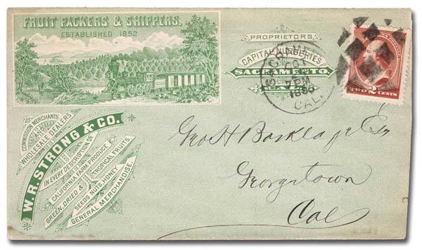 1883, 2¢ Washington, red brown (Scott 210), a beautiful well centered example with jumbo margins, tied by Sacramento Cal 1885 postmark on a Fruit Packers advertising cover. Slightly reduced at right, Fine to Very Fine. Estimate $75 - 100. (Image)