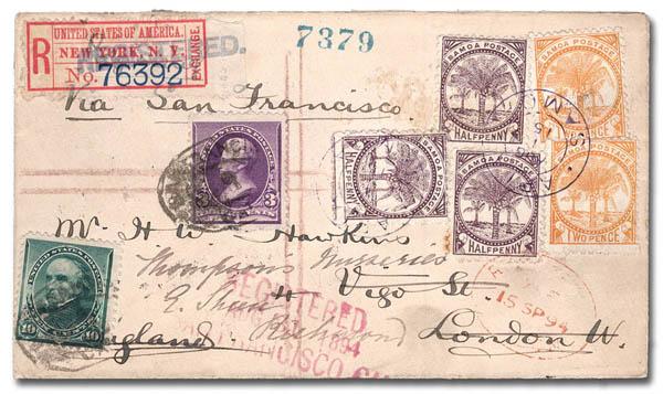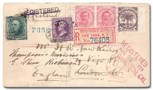 1890, 3¢ Jackson, purple + 10¢ Webster, green (Scott 221, 226), on 1894 registered cover from Samoa to London, England, via San Francisco and New York, with an array of interesting and colorful transit markings, Fine to Very Fine. Estimate $500 - 750