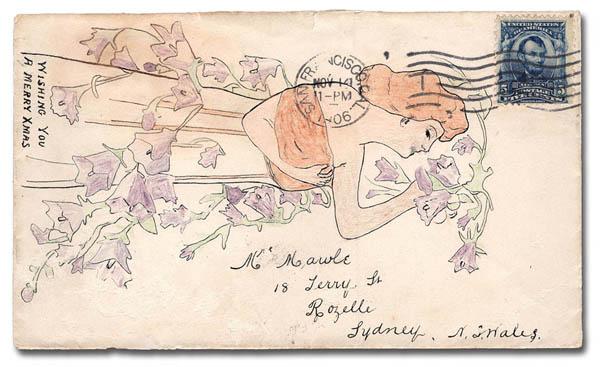 1903, 5¢ Lincoln, blue (Scott 304), tied by San Francisco 1906 postmark on a lovely hand drawn illustrated cover to Sydney, Australia, Very Fine. Estimate $200 - 300. (Image)