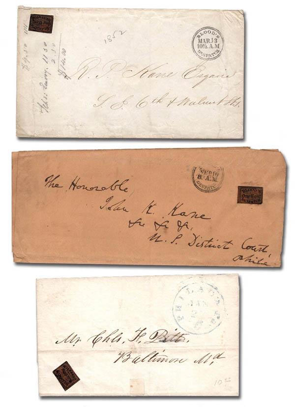 1850's, Blood's Despatch, a group of 11 covers, some with stamps, some with only the handstamp and a few with both; usual wear as shown in images; a neat offering of Local covers, generally Fine to Very Fine. Estimate $200 - 300. (Image)