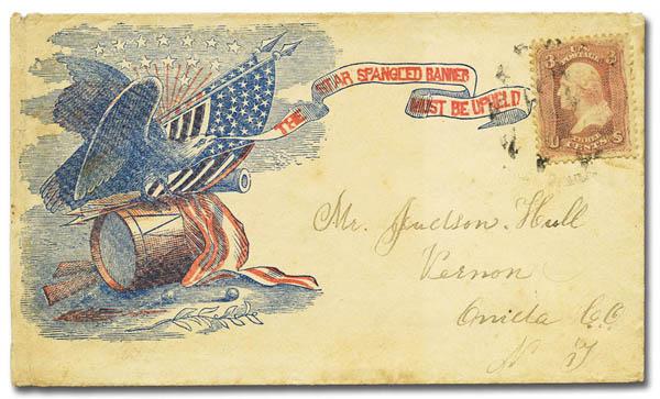 c. 1861, Civil War patriotic cover: Eagle and Flags (Walcott L-2579 var. Weiss E-R-245), an elaborate almost all-over bicolor design on a cover to upstate New York, with a light cancel tying a 3¢ (#65), Fine to Very Fine. Estimate $75 - 100. (Image)