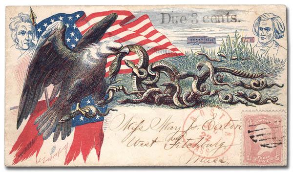 1861, 3¢ Washington, rose, used on "The Snake of South Carolina" multicolored patriotic cover (Scott 65), depicting an American eagle destroying the Confederate flag and 13 secessionist serpents, with Union Flag and Andrew Jackson in background, a portrait of Calhoun at right, Due 3 cents handstamp at top and a red wonderfully struck July 22 Boston Mass c.d.s. at bottom. The imprint on back reads "The destruction of the Snake of South Carolina, Nullification and Secession, and all her progeny by the National Bird. To portray the ultimate overthrow of the evil power, which strikes at the life of the National Government, is the object of this cut" and Harback & Sons copyright notice. In excellent, near-pristine condition, a wonderfully choice example of this rare design (unlisted by Walcott and Weiss), Very Fine to Extremely Fine. Estimate $5,000 - 7,500