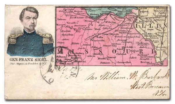 c. 1861, "Gen. Franz Sigel" on a Magnus multicolor patriotic cover (Weiss PM-247), indistinct postmark, no stamp, addressed to New Hampshire, Fine to Very Fine. Estimate $500 - 750. (Image)