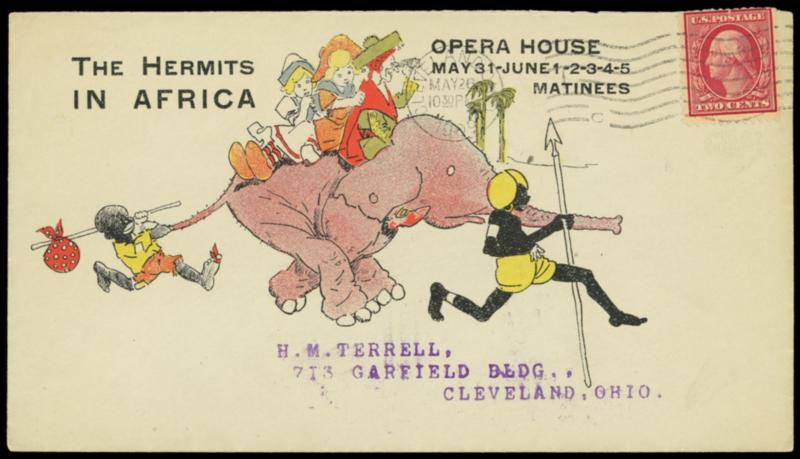 (Circus) The Hermits in Africa Company. Multicolor overall advertising design showing Elephant and Black African handlers illustration, promoting their show at the Opera House on cover bearing 2¢ carmine tied by "Cleveland, Ohio May 26, 1909" machine cancel to local street address, Very Fine and striking Black Americana design. Estimate; $400 - 600. US$400-600 (Image)