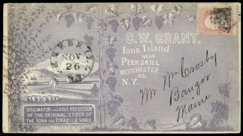(Agricultural) C.W. Grant Vineyard, Iona Island, Peekskill N.Y. Overall purple lithographed vineyard advertising design showing grapes on vines around the address panel and farm scene at left, Holton N.Y. imprint, on cover bearing 3¢ rose (65) tied by cork cancel, matching "Peekskill N.Y. Nov 26" cds to Bangor Me., 1864 docketing at left; hint of edge toning, F.-V.F. and beautiful advertising cover. Estimate; $200 - 300. US$200-300 (Image)