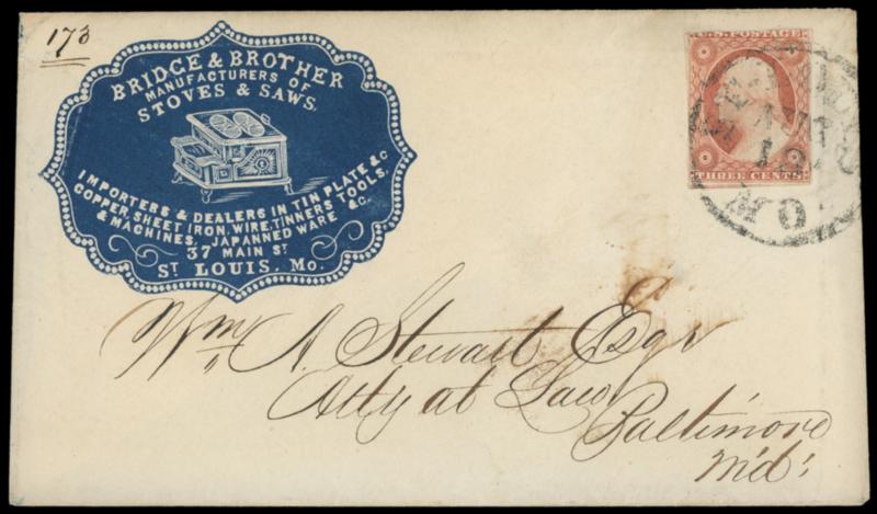 Bridge & Brother, Stoves and Saws, St. Louis Mo. Blue embossed shield cameo corner card with stove illustration on cover bearing 3¢ dull red (11A) margins to in, tied by "St. Louis Mo. Aug 18" cds to Baltimore Md., with original 1854 letter, Very Fine and scarce St. Louis cameo. Estimate; $150 - 200. US$150-200 (Image)