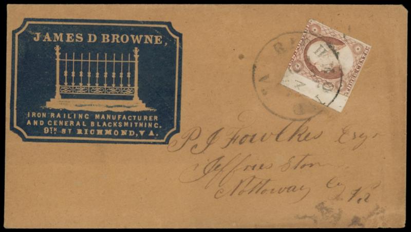James D. Browne, Iron Railing and General Blacksmithing, Richmond Va. Blue illustrated cameo showing railing on buff cover bearing 3¢ dull red (11A) left sheet margin single, scissor cut in margin, tied by "Richmond Va. Jun 24" cds to Jeffries Store Va.; faint spots at bottom right, Very Fine Virginia cameo. Estimate; $300 - 400. US$300-400 (Image)
