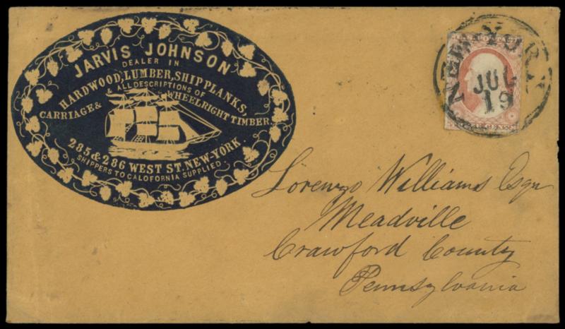(Cameo) Jarvis Johnson, Dealer in Hardwood, Lumber, Shipping Planks etc, New York N.Y. Blue embossed cameo corner card with illustration of three-masted ship, elaborate design with grapevines surrounding the ship and wording, on orange buff cover bearing 3¢ dull red (11A), full margins except touched at right, tied by "New-York, Jul 19" cds to Meadville Pa., an outstanding design, with 2006 P.F. certificate, Very Fine and outstanding cameo design. Estimate; $500 - 750. US$500-750 (Image)