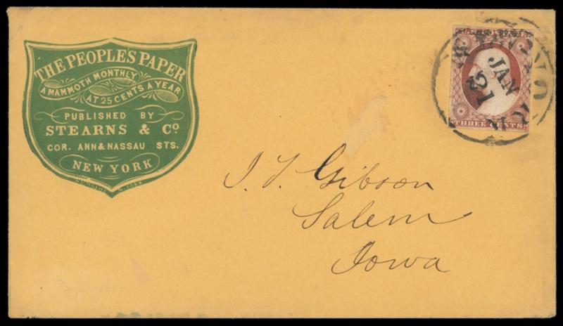 (Cameo) The Peoples Paper, Stearns & Co., New York. Embossed green shield cameo corner card with "W. Murphy, New York" imprint on buff cover bearing 3¢ dull red (11A), four margins, tied by "New-York, Jan 21" cds to Salem, Iowa; abrasion spot, Very Fine,ex-Biddle. Estimate; $150 - 200. US$150-200 (Image)