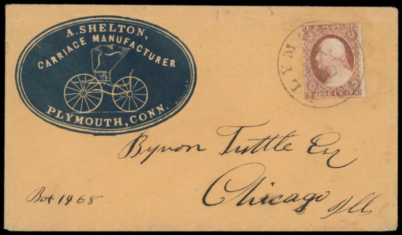 A. Shelton, Carriage Manufacturer, Plymouth Conn. Blue embossed oval cameo illustrated with carriage on orange buff cover bearing 3¢ dull red (11A), large margins to touched, minor score mark, tied by "Plymouth Ct. Jul 10" cds to Chicago Ill., a Very Fine and beautiful cameo. Estimate; $300 - 400. US$300-400 (Image)