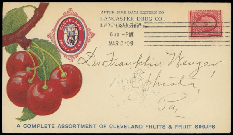 Cleveland Fruit Juice Co. Multicolor ad cover with logo and cherries, "Buckeye Rootbeer" ad on reverse, on 1909 cover bearing 2¢ carmine tied by "Lancaster, Pa. Mar 2 '09" machine cancel to Ephrata Pa., Very Fine and beautiful ad. Estimate; $200 - 300. US$200-300 (Image)