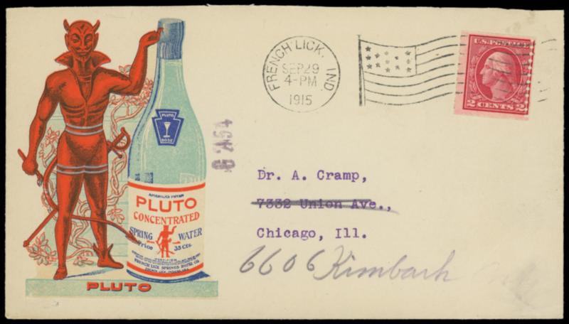 Pluto Concentrated Spring Water. Multicolor illustrated design showing Devil and Pluto Bottle, on cover bearing 2¢ carmine (453) coil tied by "French Lick, Ind. Sep 29, 1915" machine cancel to Chicago Ill., forwarded locally, arrival backstamp, Extremely Fine. Estimate; $150 - 200. US$150-200 (Image)
