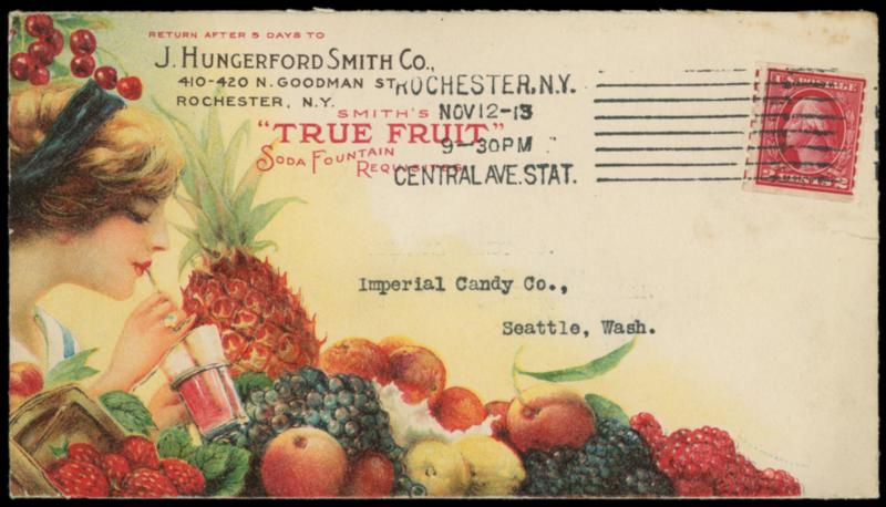 "True Fruit" Soda Fountain Requisites, Rochester N.Y. Multicolored illustrated agent ad design showing Women Drinking Soda and Various Fruit on Southern Drug Co. corner card cover bearing 2¢ red tied by "Rochester N.Y. Nov 12 -13" machine cancle to Seattle Wash.; tiny edge tear at right, Very Fine and wonderful ad design. Estimate; $300 - 400. US$300-400 (Image)