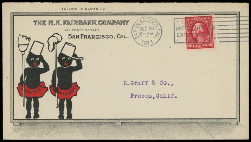 The N.K. Fairbank Co., Gold Dust Powder, The N.K. Fairbank Co., San Francisco Cal. Red and black advertising design showing the Gold Dust Twins on cover bearing 2¢ carmine (413) coil tied by "San Francisco, Cal. Dec 26, 1913" Panama-Pacific Expo machine cancel to Fresno Cal., Very Fine,ex-Gabriel. Estimate; $150 - 200. US$150-200 (Image)