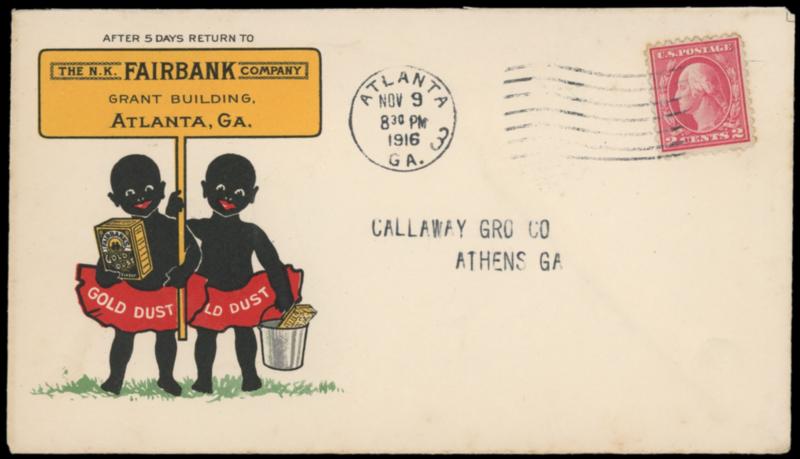 Fairbank's Gold Dust Powder, The N.K. Fairbank Co., Atlanta Ga. Multicolor advertising design showing the Gold Dust Twins holding a Sign on cover bearing 2¢ Wash. tied by "Atlanta Ga. Nov 9, 1916" machine cancel to Athens Ga., Very Fine. Estimate; $200 - 300. US$200-300 (Image)