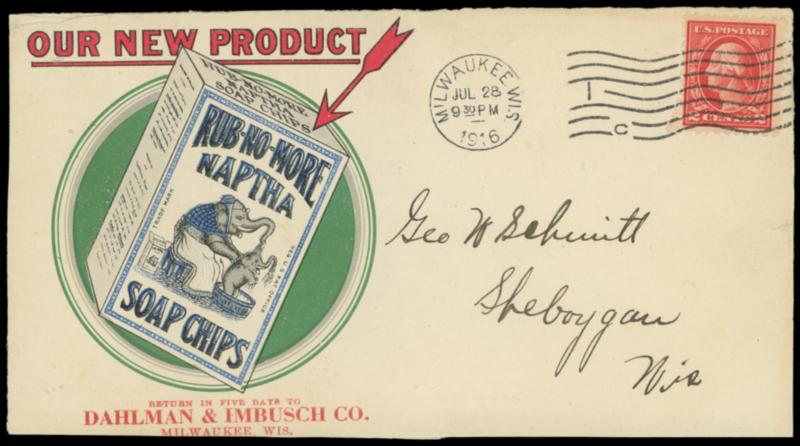 Rub-No-More Naptha Soap Chips. Multicolor advertising design illustrated with product box showing Mother Elephant in Apron Washing Baby Elephant on cover bearing 2¢ carmine tied by "Milwaukee Wis. Jul 28, 1916" machine cancel to Sheboygan Wisc., Extremely Fine. Estimate; $200 - 300. US$200-300 (Image)