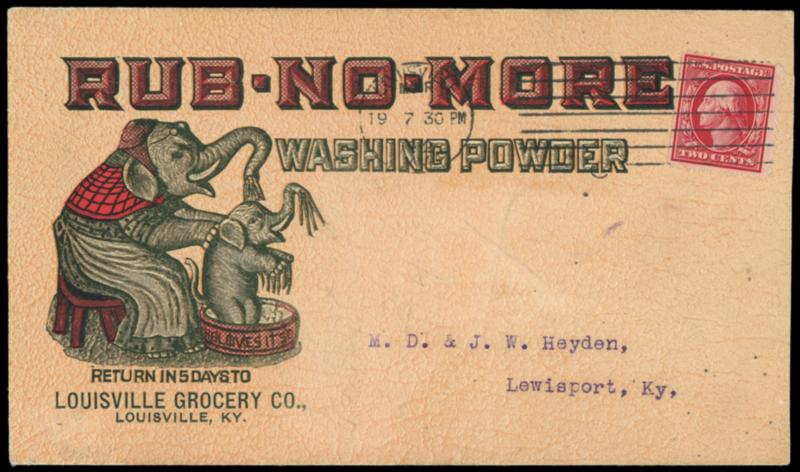 Rub-No-More Washing Powder, Louisville Ky. Overall advertising design illustrated with Mother Elephant in Apron Washing Baby Elephant, reverse with additional text ad on cover bearing 2¢ carmine (375) tied by "Louisville Ky. Mar 19, 1912" machine cancel to Lewisport Ky., arrival backstamp, Very Fine. Estimate; $200 - 300. US$200-300 (Image)