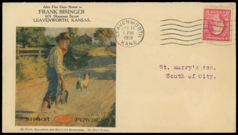 (Gun & Powder) DuPont Powder. Multicolor ad cover with illustration of a boy holding a gun and the days kill on cover bearing 2¢ carmine tied by "Leavenworth, Kans. Oct 11, 1919" machine cancel to local city address, Very Fine and rare gun design. Estimate; $750 - 1,000.