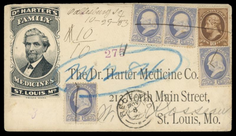 (Medical) Dr. Harter's Family Medicines, St. Louis Mo. Beautiful illustrated design showing framed Dr. Harter trademark on registered return envelope bearing pen canceled 1¢ gray blue (206), four singles, and 10¢ brown (209), matching "Callisburg Tex, 10-29-83" postmark and "10/10" registry numbers to St. Louis Mo. where "Received, Nov 3" cds struck, blue crayong, Very Fine and rare Dr. Harter's ad. Estimate; $500 - 750. US$500-750 (Image)