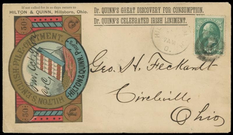 (Medical) Hilton's Pile Ointment, Hilton & Quinn Prop's., Hillsboro Oh. Multicolor bronze and gold leaf advertising design with "Dr. Quinn's Great Discovery for Consumption." slogan on cover bearing 3¢ green (207) tied by target cancel duplexed with partial "Hillsborough O. Oct 18" cds to Circleville, Ohio, Oct. 19th arrival backstamp, Very Fine and stunning medical ad, with 2002 P.F. certificate. Estimate; $200 - 300. US$200-300 (Image)