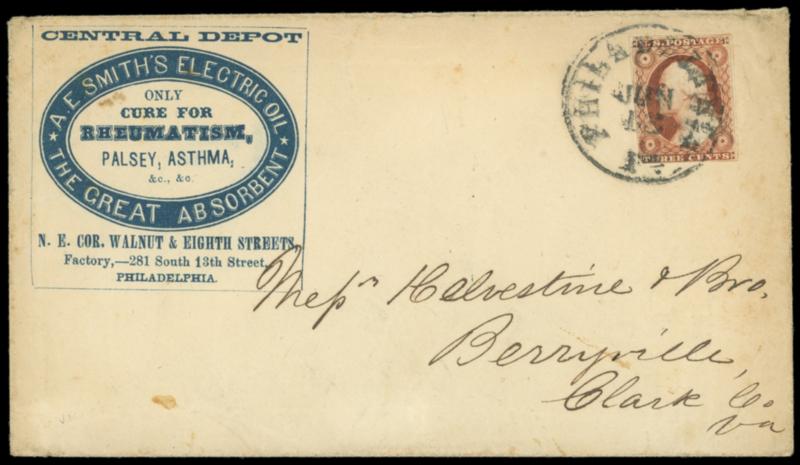 (Medical) A.E. Smith's Electronic Oil, Cure for Rheumatism, Philadelphia Pa. Blue oval corner card and and reverse with overall illustrated "Dr. Smith's Central Family Medicine Depot" building surrounded surrounded by extensive claims of the oil's curative powers, on cover bearing 3¢ dull red (11), margins to touched, tied by "Philadelphia Pa. Jun 13" cds to Berryville Va., Very Fine and wonderful example of early quack medicine. Estimate; $300 - 400. US$300-400 (Image)