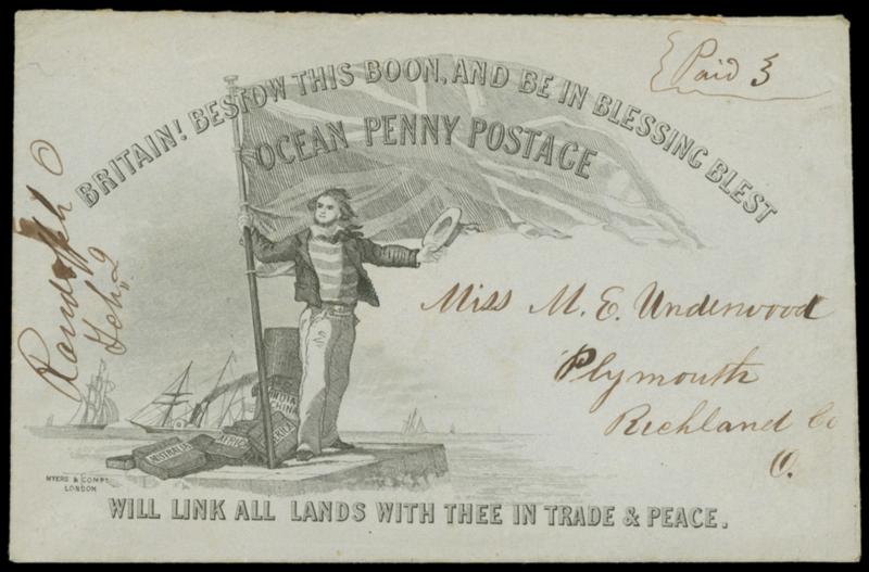 (Ocean Penny Postage) Ocean Penny Postage, Britain! Bestow This Boon, and Be in Blessing Blest. Myers & Co. illustrated design on gray cover with manuscript "Randolph, O., Feb 2" postmark at left and "Paid 3" rating at top right to Plymouth, Ohio; bit of flap missing, Very Fine. Estimate; $1,000 - 1,500.